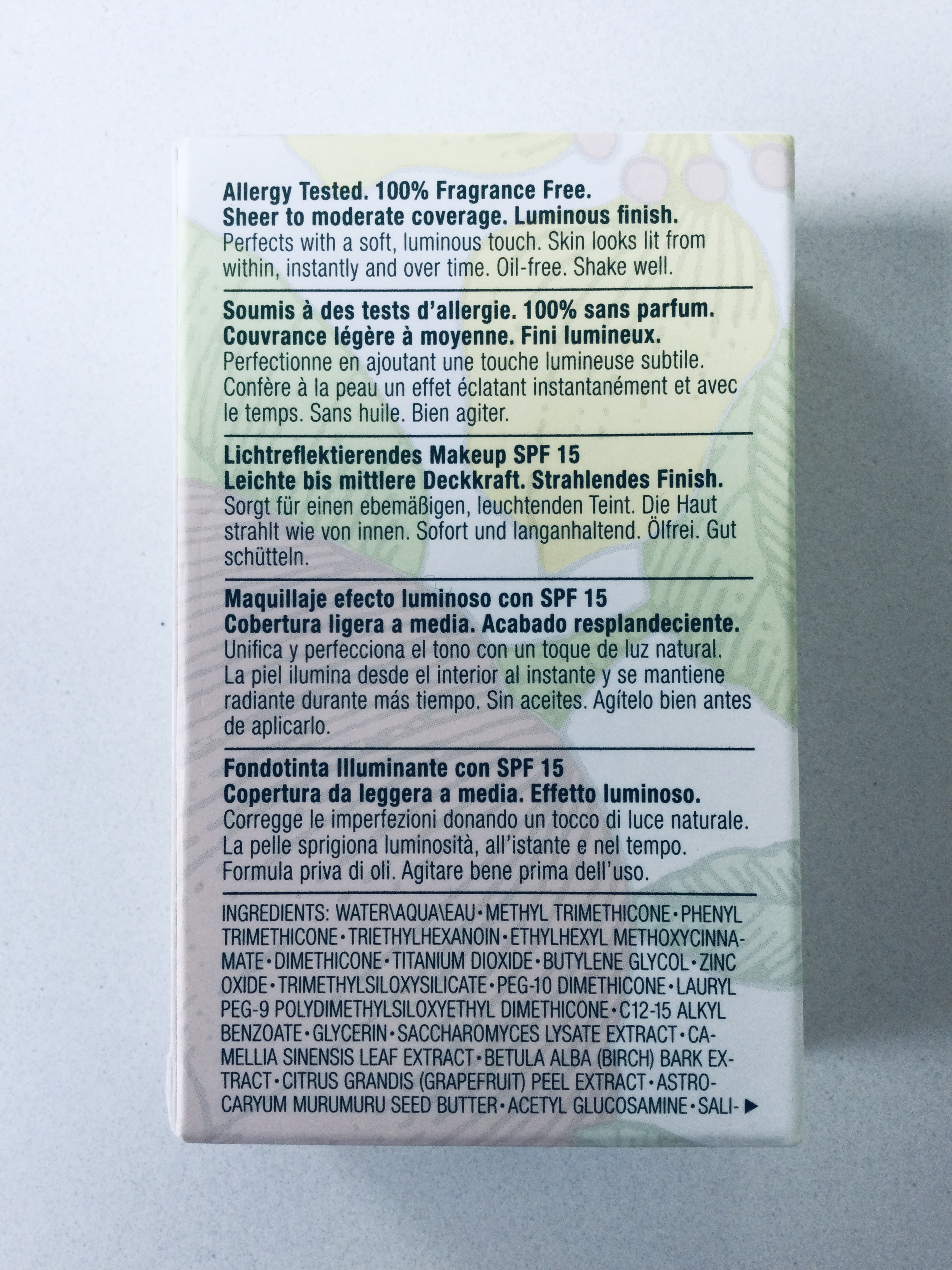 Sowieso biedt een dergelijk product niet de bescherming die je van een SPF die je apart toevoegt aan je dagverzorging (Dokter Ultee Suncare is mijn favoriet) wel mag verwachten. Van een zonneproduct breng je (als het goed is) een iets royaler laagje van aan om effectief te zijn, wat per definitie met een foundation niet het geval is (want je wil geen “masker” op je gezicht).