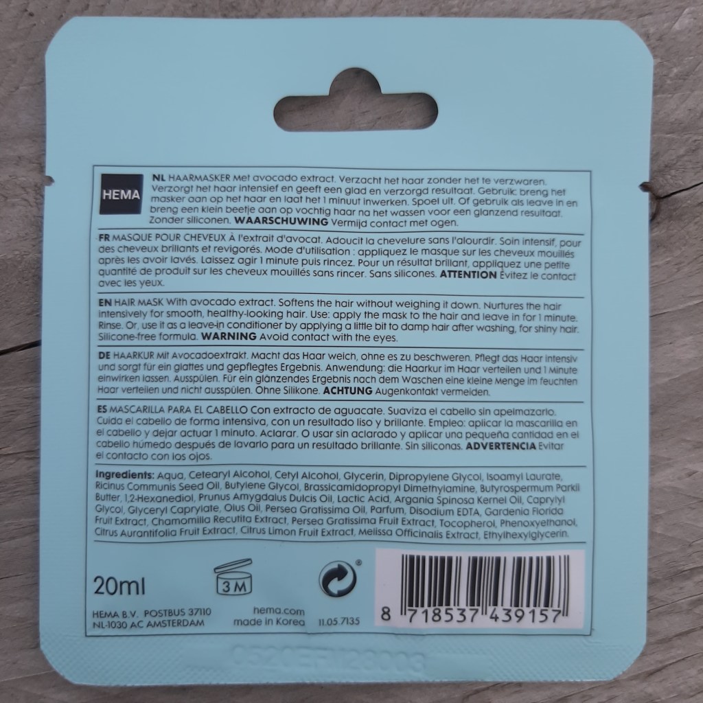 Daarnaast probeerde ik intussen ook al het 1-minute hair-mask met kokos uit; dit masker op basis van amandel- en kokosolie breng je aan op gewassen haar. Na een minuutje kun je het al uitspoelen, of je gebruikt het als “leave-in” verzorging na het wassen op handdoekdroog haar. Door het jarenlange mishandelen van mijn haar met kleurspoelingen zien de punten van mijn haar er vaak uit als stro; na één beurt zien ze er al een stuk beter uit! Het haarmasker met avocado (op basis van avocado-extract en shea butter) bewaar ik voor binnenkort. Tip: masseer het masker voor het slapengaan in de punten en lengten van je haar in, trek er een oud T-shirt over en was je haar de volgende ochtend uit: een slaapmasker voor je haar! Waarschuw best even op voorhand je vriend want de mijne dacht even dat hij met tante nonneke in bed was beland…