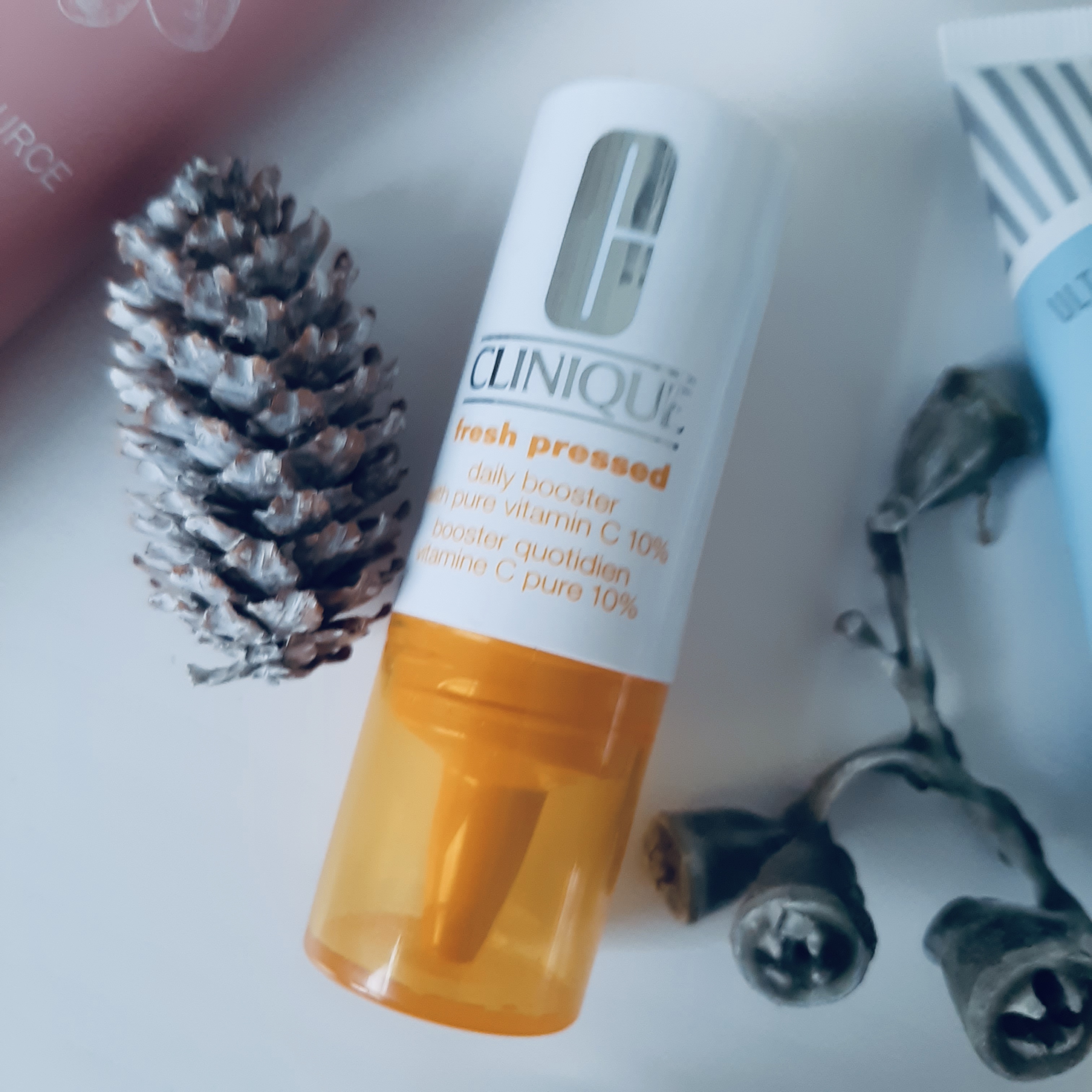 Geen skincare zonder vitamine C… al zijn er een paar voorwaarden verbonden aan het correct gebruik, meer daarover in mijn vorige post (zie link). Het mooie aan het Clinique systeem is dat het zo mooi voldoet aan al deze voorwaarden, handig is in gebruik én je heel snel effect ziet. Zeven dagen lang gebruik je ’s ochtends het poeder in het zakje om je huid mee te reinigen (met een beetje lauw water je gezicht mee inmasseren en vervolgens een minuutje laten inwerken alvorens af te spoelen). Het heeft een absorberend en licht exfoliërend effect dankzij kaolien (witte klei) en vitamine C, waardoor de huid automatisch dode huidcellen gaat afstoten, haar natuurlijke gloed terug vindt, en de daaropvolgende producten veel beter hun werk kunnen doen. Vervolgens breng je de vitamine C booster aan: twee druppels (!) toegevoegd aan je moisturizer volstaan van deze krachtpatser. Aangezien je de booster binnen de zeven dagen moet opgebruiken, en je er eigenlijk heel weinig van nodig hebt, gebruik ik hem een week lang zowel ’s ochtends als ’s avonds.Het effect is quasi onmiddellijk merkbaar: een heldere teint, met een mooie spontane glow!